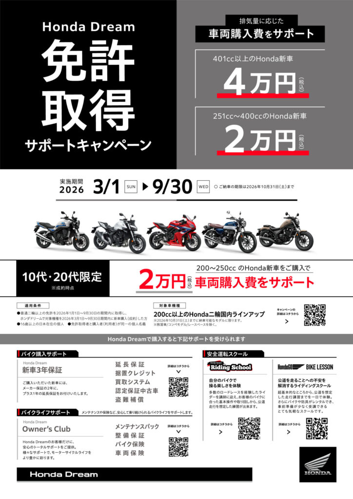 サポート内容:401cc以上のHonda車 4万円サポート 251cc~400ccのHonda車 2万円サポート